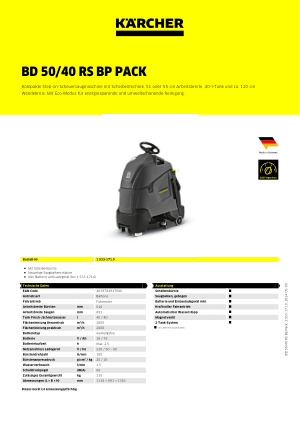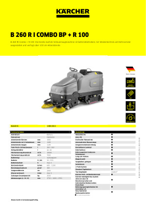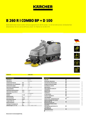 Ein Walzenbürstenkopf mit 85 cm Arbeitsbreite, ein Seitenbesen sowie ein robuster Aluminium-Saugbalken sind Standard. Flächenleistung von 6800 m²/h und 8 km/h Arbeitsgeschwindigkeit.