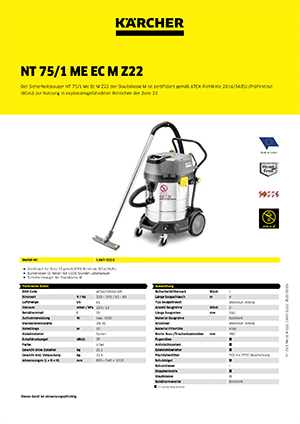 Der Sicherheitssauger NT 75/1 Me Ec M Z22 der Staubklasse M ist zertifiziert ge­mäß ATEX-Richtlinie 2014/34/EU (Prüf­institut IBExU) zur Nutzung in explosions­ge­fährdeten Bereichen der Zone 22.