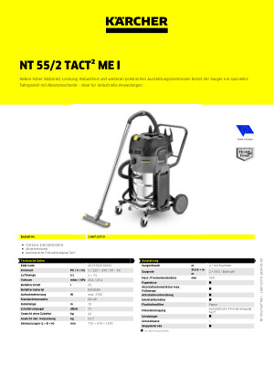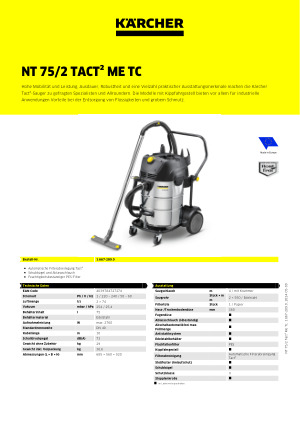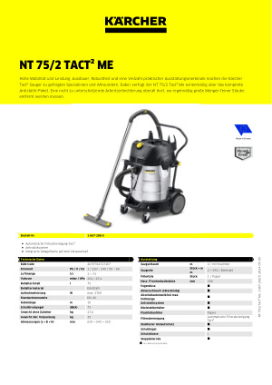 Hohe Mobilität und Leistung, Ausdauer, Robustheit und eine Vielzahl praktischer Ausstattungsmerkmale machen die Kärcher Tact²-Sauger zu gefragten Spezialisten und Allroundern. Dabei verfügt der NT 75/2 Tact² Me serienmäßig über das komplette Antistatik-Paket. Eine nicht zu unterschätzende Arbeitser leichterung überall dort, wo regelmäßig große Mengen feiner Stäube entfernt werden müssen.