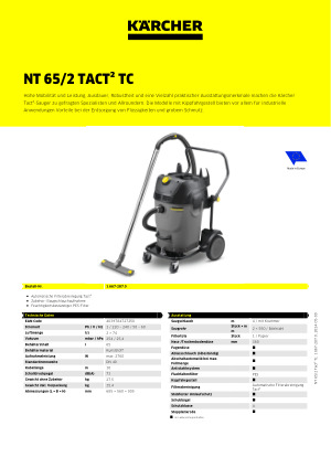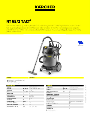 Hohe Mobilität und Leistung, Ausdauer, Robustheit und eine Vielzahl praktischer Ausstattungsmerkmale machen die Kärcher Tact²-Sauger zu gefragten Spezialisten und Allroundern. Dabei ver fügt der NT 65/2 Tact² serienmäßig über das komplette Antistatik-Paket. Eine nicht zu unter schätzende Arbeits er leichterung überall dort, wo regelmäßig große Mengen feiner Stäube entfernt werden müssen.